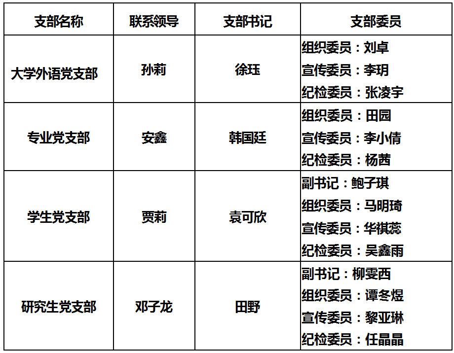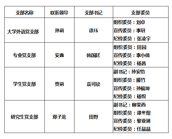 党总支委员:安鑫(宣传委员)、孙爱军(组织委员)、韩国廷(统战委员)